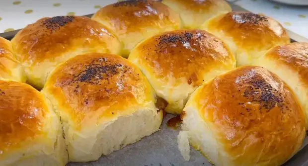 Пышные булочки можно сделать с начинкой, для этого раскатайте колобки в лепешки и положите желаемое наполнение. Кроме того, поверхность булочек рекомендуем посыпать маком или кунжутом.